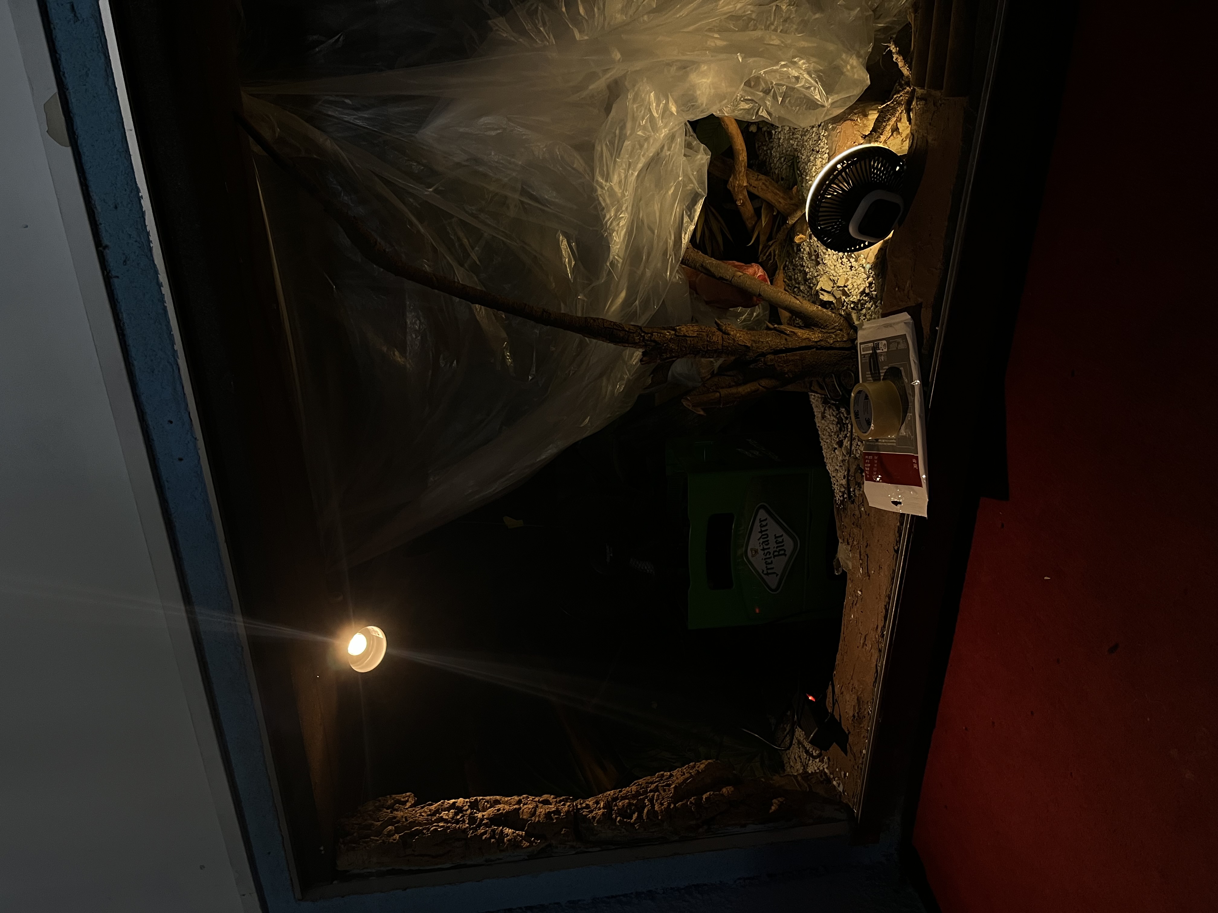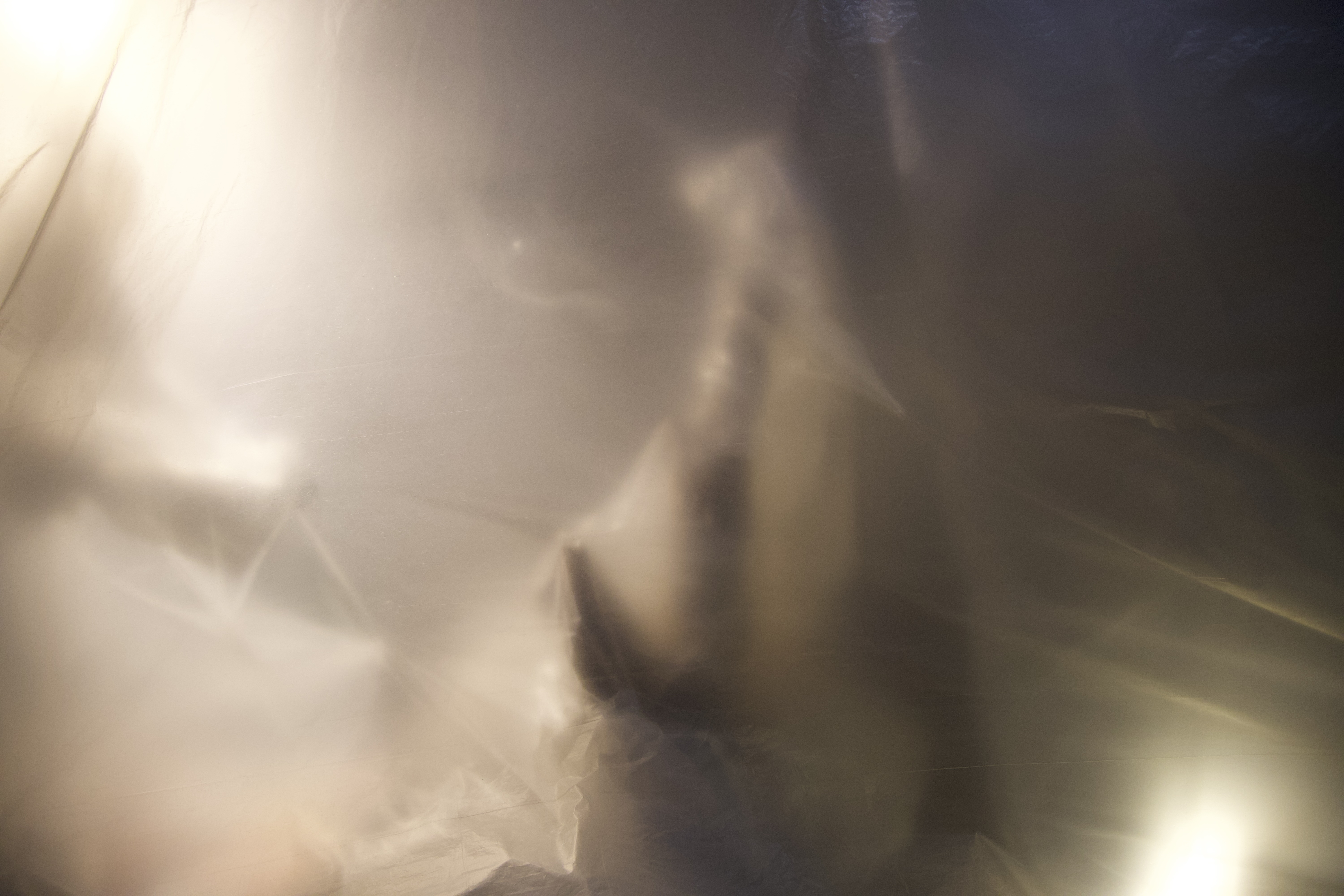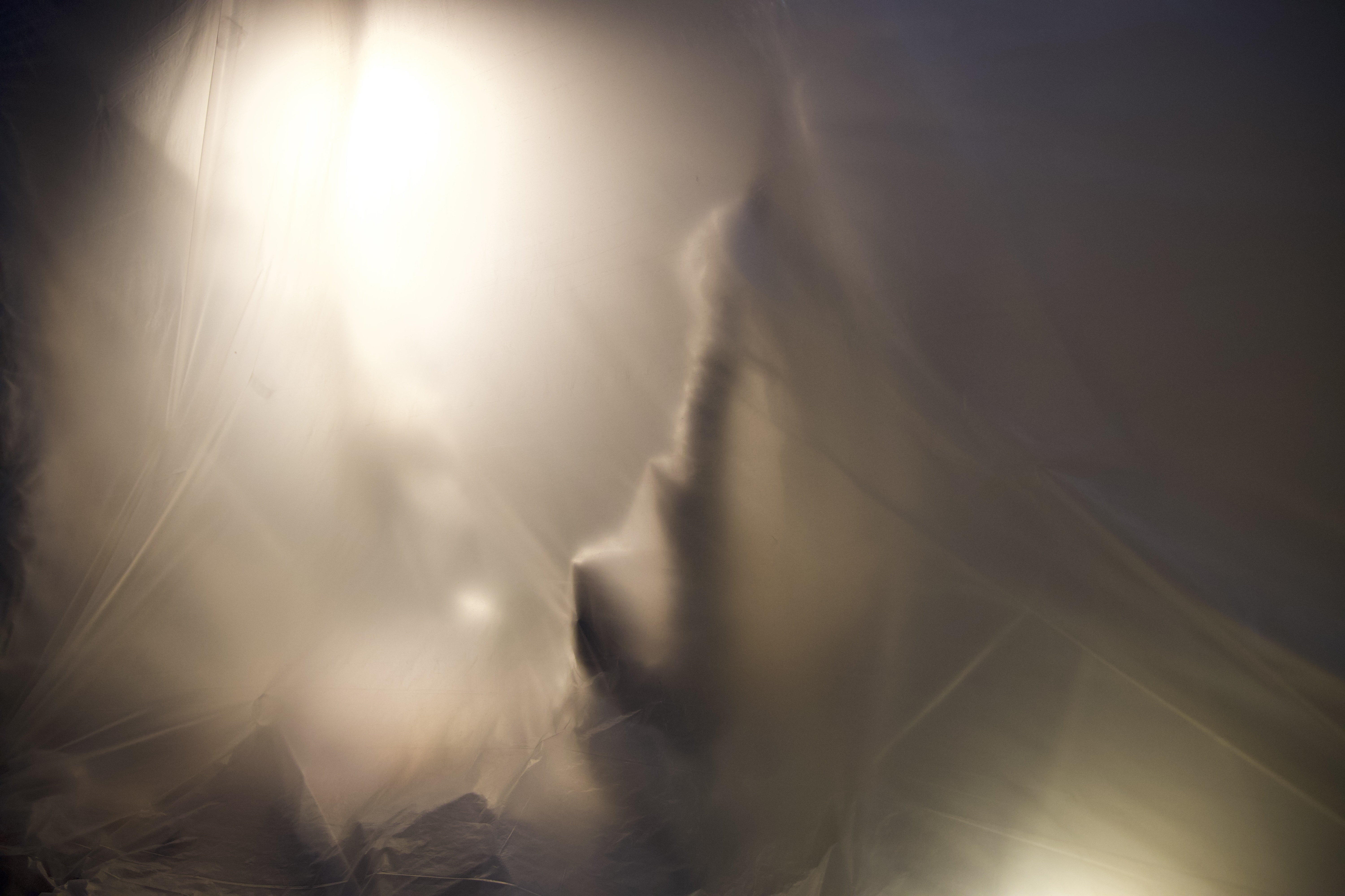 The installation presents a physical and auditory experience centered around a simple yet compelling structure: a plastic bubble sculpture, gently animated by a hidden fan. The soft, undulating movement of the plastic creates a rhythmic, breathing-like quality. The air itself feels alive as it pushes and pulls the plastic in a delicate dance. This breathing motion serves as the main visual cue that something is “alive,” but not human, animal, or organic.